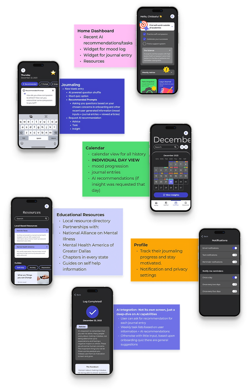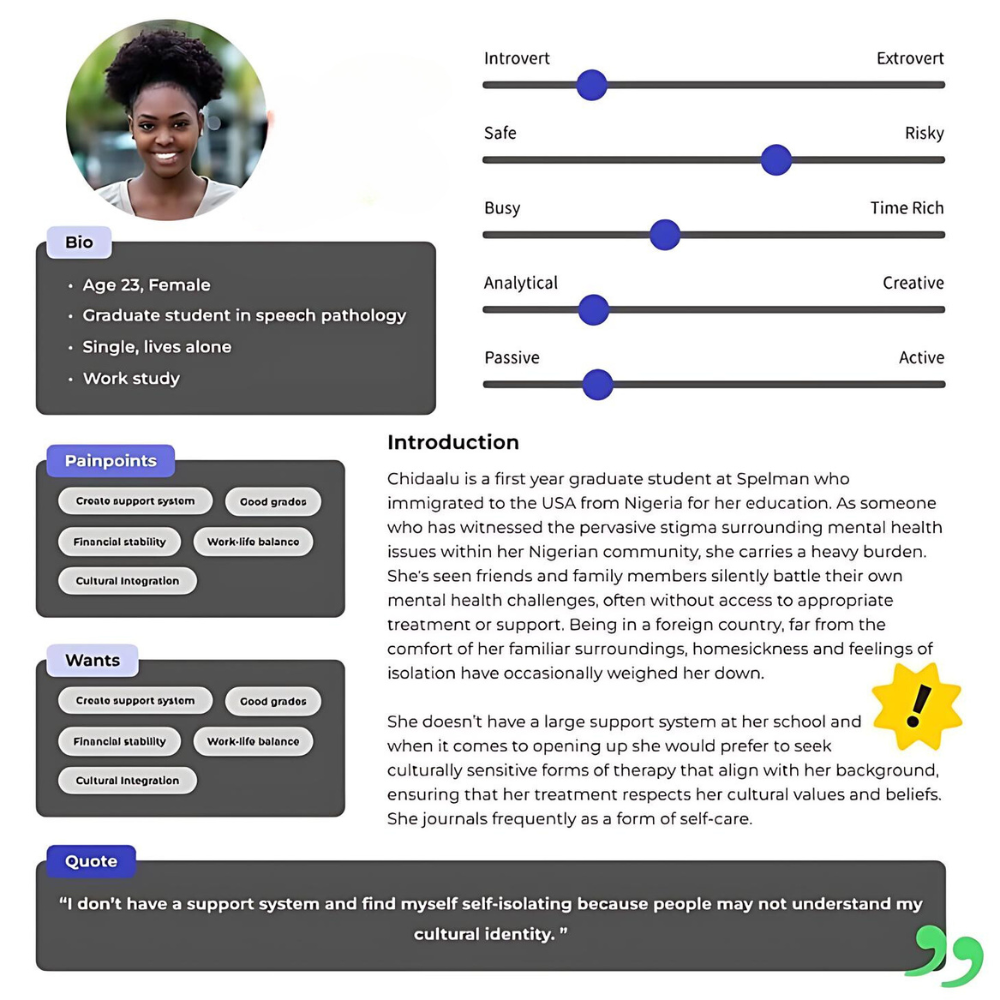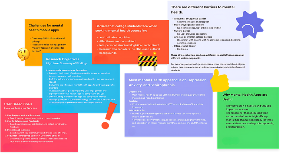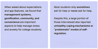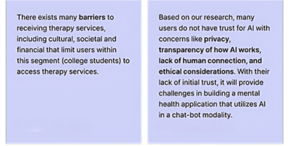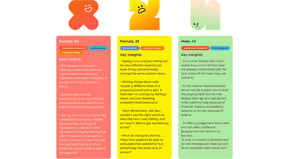 In these interviews, we spoke with a range of relevant people (current students, people who have taken therapy, tech and mental health professionals) about their backgrounds, experience, views on AI, and what tools would help them improve their mental health, and what features would benefit them.